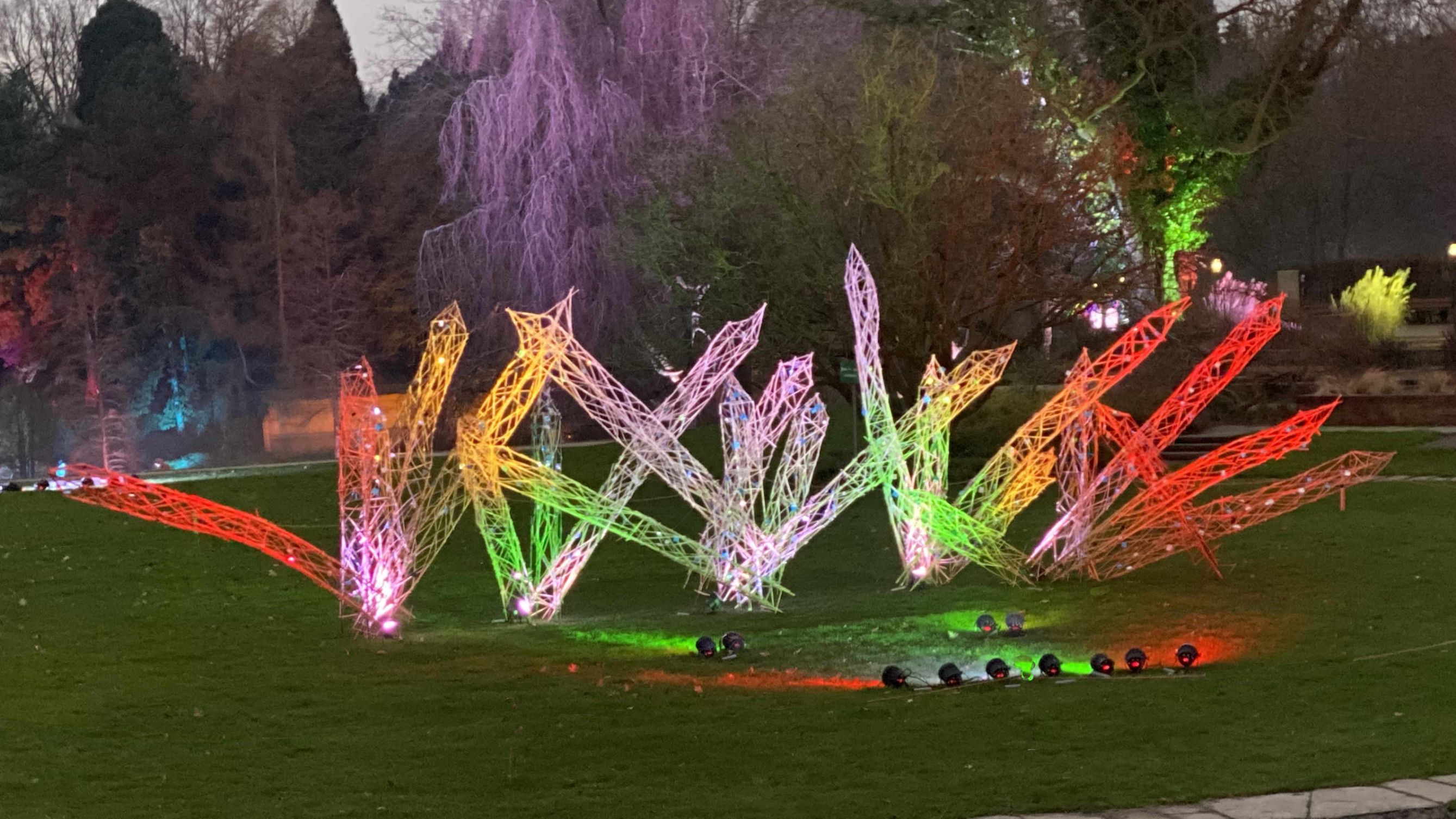 LED-Scheinwerfer lassen das Areal in allen Regenbogenfarben zu einer eine Leuchtkulisse erstrahlen. Die „Darsteller“ darin sind kunstvoll gestaltete Lichtobjekte, die hier ihren großen Auftritt haben. Die „Stars“ in diesem Jahr sind die Pinguine. Fotos folgen. Eine ganze Parade der leuchtenden Gesellen tummelt sich in Lebensgröße auf der großen Wiese von der Orangerie bis zum Grugaturm. Flankiert werden die Pinguine von emsigen Leuchtstrichmännchen.
