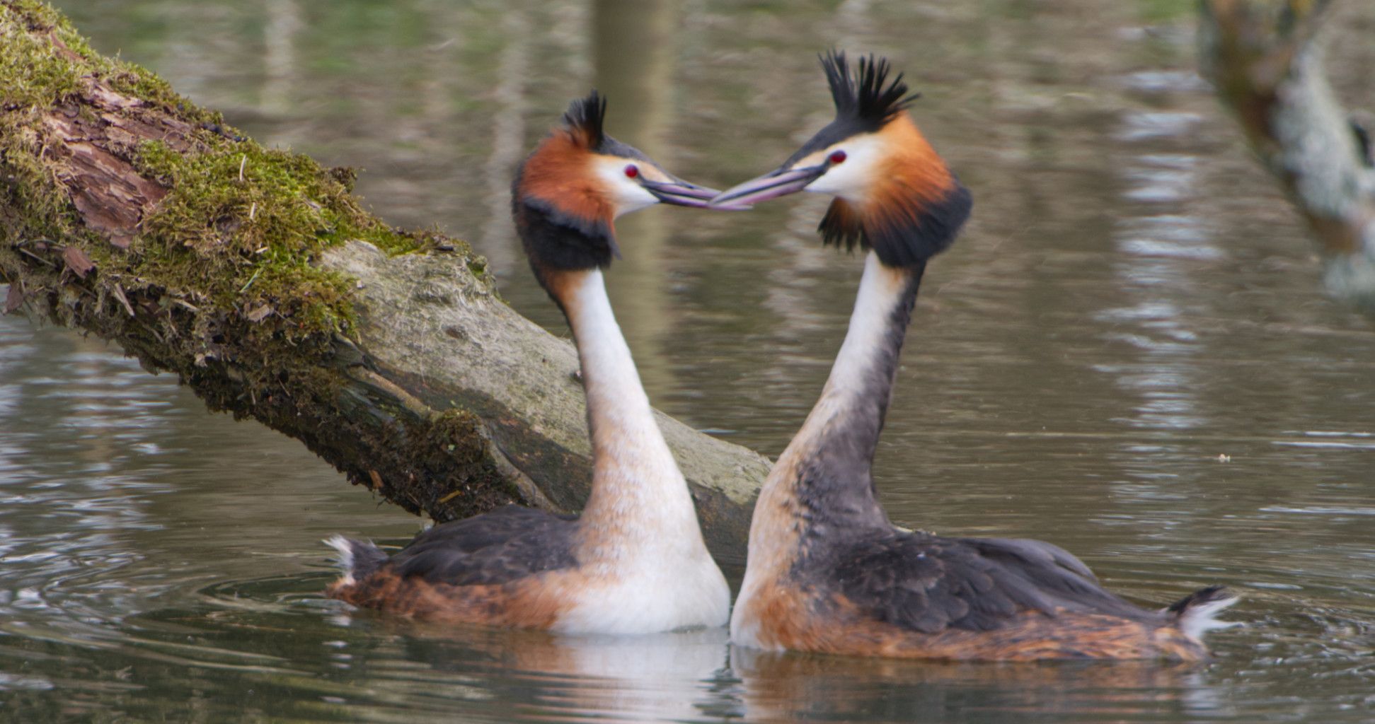 Sehr selten und wenn dann auch nur sehr scheu. Eben deshalb sehr, sehr schwer zu beobachten die Haubentaucher. An der Ruhr in Mülheim haben einige dieser imposanten Wasservögel schon seit mehreren Jahren ihr zu Hause gefunden. Um es genau zu sagen, nicht direkt auf der Ruhr, sondern in einem Teich neben der Ruhr. Nur durch einen Leinpfad getrennt. Also bei großem Besucheraufkommen oder vielen Spaziergängern ist es ein Glücksspiel die seltenen Vögel überhaupt zu Gesicht zu bekommen. Heute war das Glück auf meiner Seite, keine oder nur sehr wenige Spaziergänger die, die Wasservögel, wenn auch nur unbewusst verjagten. Mit der etwas aufwendigen Fotoausrüstung unterwegs habe ich mir viel Zeit genommen, um diese Flattermänner zu Gesicht bzw auf die Speicherkarte der Kamera zu bekommen. Beim Aufbau meines Fotostativs, dem Teleobjektiv samt Kamera habe ich keine hastigen Bewegungen gemacht, alles wie Zeitlupe und noch langsamer. Toll jetzt kann es losgehen. Die Vögel jedoch bevorzugten erst einmal die andere Seite des Tümpels. Da reichen auch keine extremen Brennweiten von 1200mm. Nur langsam und nach langer Zeit meinten sie wohl, ich hätte es jetzt verdient. Sie zeigten sich gnädig. Ich kam zum Schuss und das nicht nur einmal. Uff jetzt bin ich wieder befriedigt.