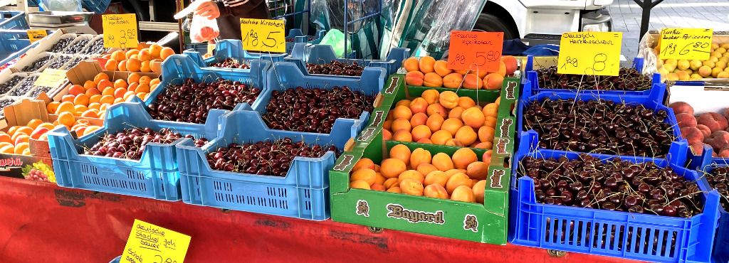 Die Kirschen in Nachbars Garten, so ein Song vom alten Peter Alexander. Herrliche Erinnerungen an die guten alten Zeiten. In welchen Revieren ich so überall herumgepirscht bin, oh ja lang, lang ist es her, heute werde ich jedoch Ersatz beschaffen und es mal mit echten Kirschen versuchen. Auch die sind zuckersüß und ich habe verlangen nach frischem jungem Gemüse. Auf geht es natürlich nicht unterm Zaun in Nachbars Garten oder in fremden Revieren, sondern ab auf den Wochenmarkt. Ja so etwas gibt es auch noch, zumindest in einer sehr kleinen Variante aber immerhin es gibt in. Und siehe da, es gibt auch Kirschen, also so richtige frische Kirschen zum direkten Vernaschen. Natürlich auch anderes Obst und viel frisches junges Gemüse. Alles wird appetitlich angeboten und kaufen kann man es natürlich auch. Wer möchte da noch in fremden Revieren pirschen. --„Ich !!!“--